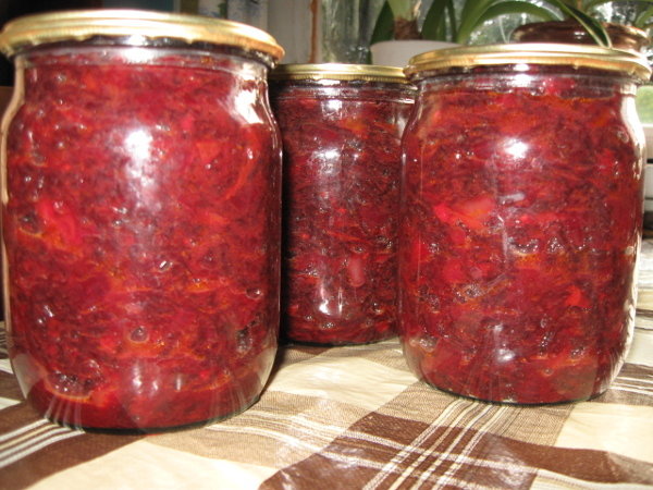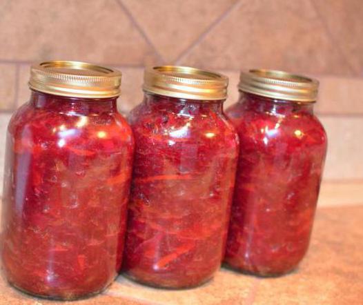 Una receta con pimientos y remolacha deliciosos y dulces es una receta muy común. Cocinar es simple: necesitas moler las remolachas, picar cebollas, zanahorias, puedes agregar tomates. Extinga todo esto con la adición de aceite, ingredientes a granel y ácido. Distribuir en recipientes calientes y enrollar. Luego cubra todo con una manta y deje enfriar. Solo entonces se puede colocar el refrigerio terminado en el armario o en el balcón para su almacenamiento.