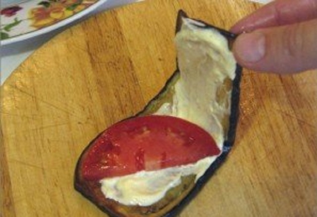 - Poner las lenguas de berenjena que se han enfriado mientras tanto en un plato, untarlas con mayonesa por un lado. Para agregar especias, puede premezclar mayonesa con queso rallado y ajo picado.