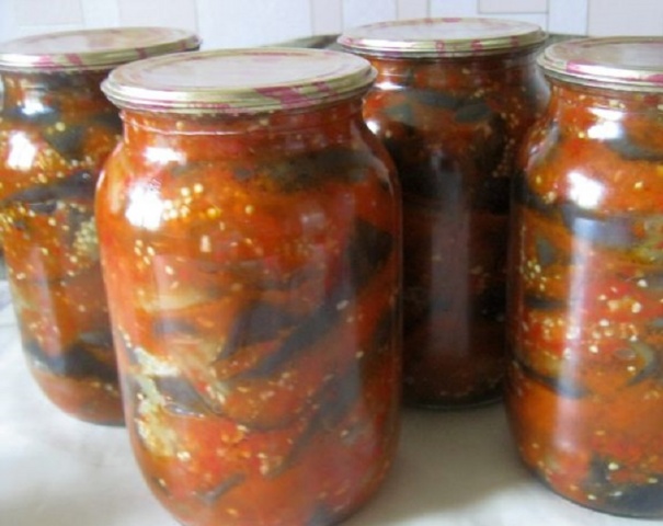 Listo ensalada de lengua de suegra poner en frascos, distribuir uniformemente la berenjena y verter. Esterilice la pieza de trabajo durante 15 minutos más en agua. Luego, enróllelo, envuélvalo y, después de enfriarlo, guárdelo para guardarlo. En la foto se puede ver qué apetitosa se ve la ensalada de berenjena de lengua de suegra, cocinada para el invierno.