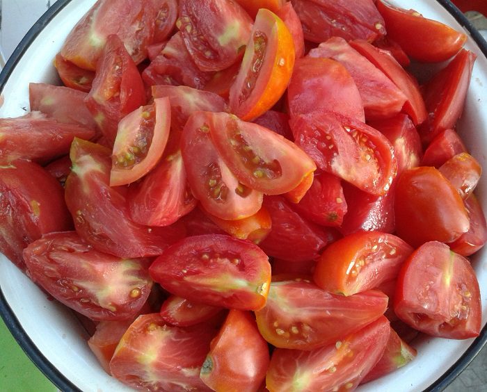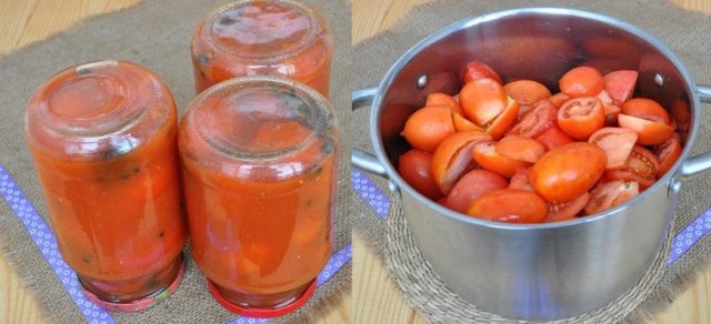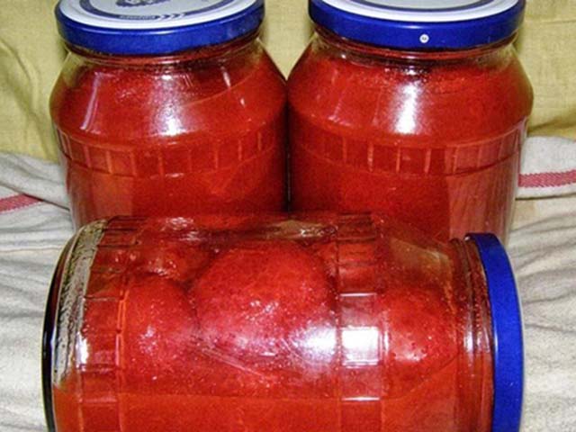 - Se vierte agua caliente de las latas de tomates por segunda vez, se vierten inmediatamente con jugo de tomate hirviendo y se aprietan inmediatamente con tapas estériles.