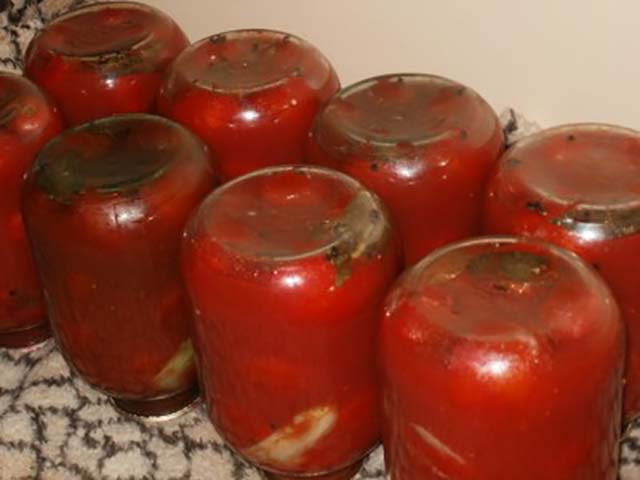 - Cada frasco se llena a su vez con tomates con relleno de tomate caliente y vegetales, se sella y se envuelve boca abajo durante 24 horas.