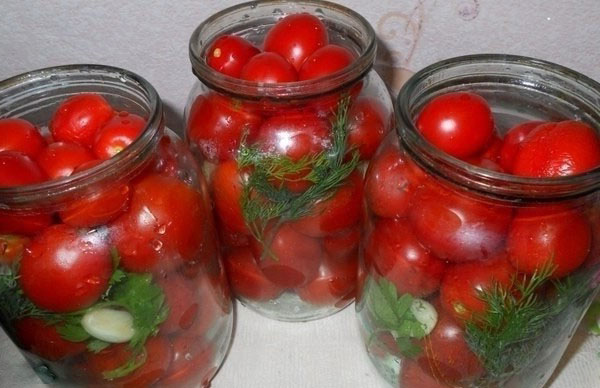 - Después de un período de tiempo específico, se escurre, se calienta nuevamente hasta que hierva y se vierte nuevamente con tomates en frascos.