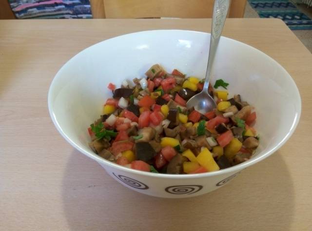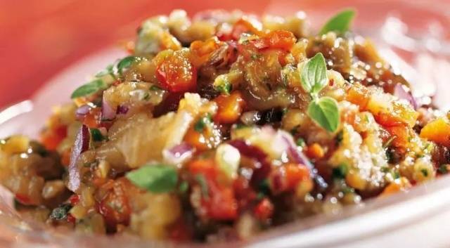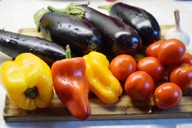 - A continuación, combine las berenjenas, los pimientos, los tomates, las cebollas, las hierbas, el ajo y el aceite vegetal. Sal y pimienta para probar. Se agrega pimiento rojo para darle un toque picante.