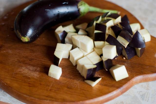 - Las berenjenas se lavan, se secan, se engrasan con aceite vegetal, se colocan en el horno para hornear en una bolsa de aluminio a una temperatura de 160 ° C durante aproximadamente 30 minutos. Luego se enfrían para que sus manos aguanten, se pelan y cortan en cubos y se fríen ligeramente en una sartén.