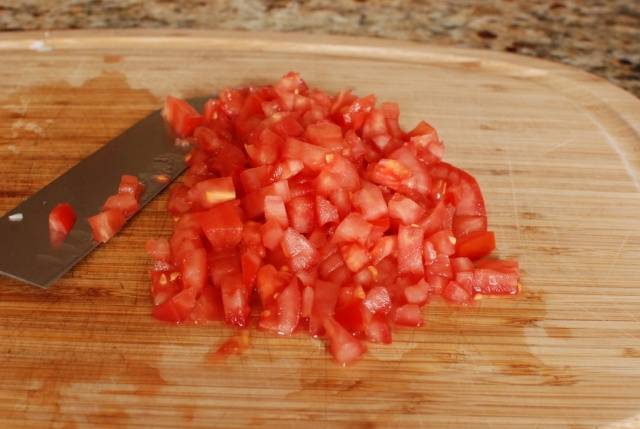 - Los tomates se pelan y se trituran en cubos.