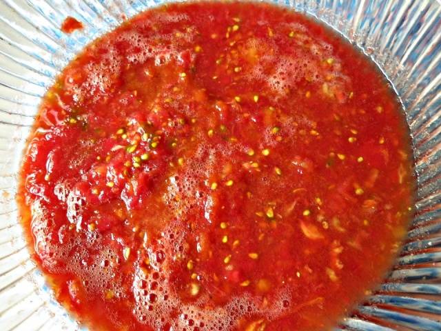 - Los tomates se lavan y pelan, se cortan en mitades, se pican con una picadora de carne o una licuadora.
