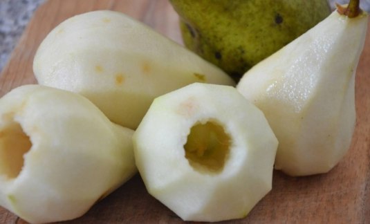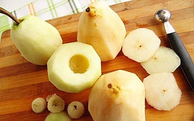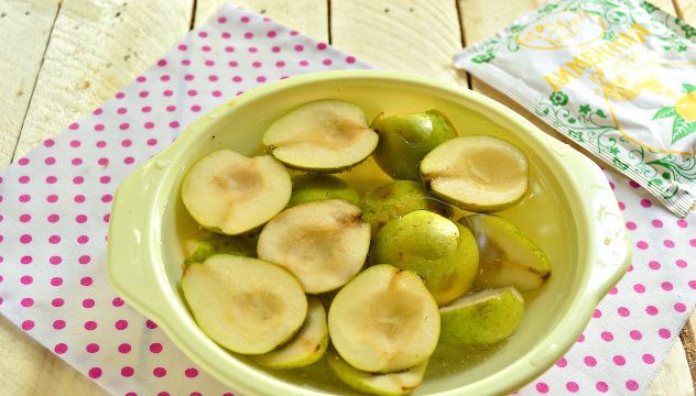 Al preparar postre en grandes cantidades (se usa más de 1 kg de fruta), primero debe preparar un recipiente con agua fría y ácido cítrico diluido en él. Se necesitará el líquido acidificado para empapar los trozos de pera en él. Para que después de cortar y antes de cocinar, la fruta no se oscurezca, pero quede un atractivo tono beige claro.