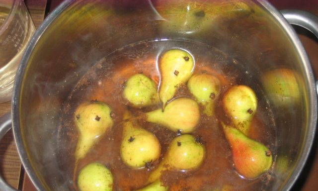 Preparaciones para el invierno en casa: peras en almíbar de azúcar con especias.