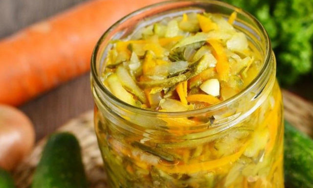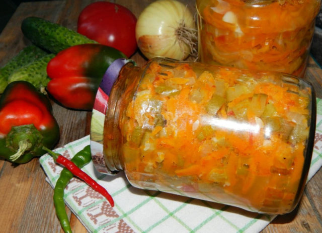 El plato se basa en pepinos encurtidos y diversas verduras. El vinagre se puede utilizar como conservante y aromatizante. Se asume un tratamiento térmico preliminar para que la pieza de trabajo resultante esté lista para su uso en cualquier momento.
