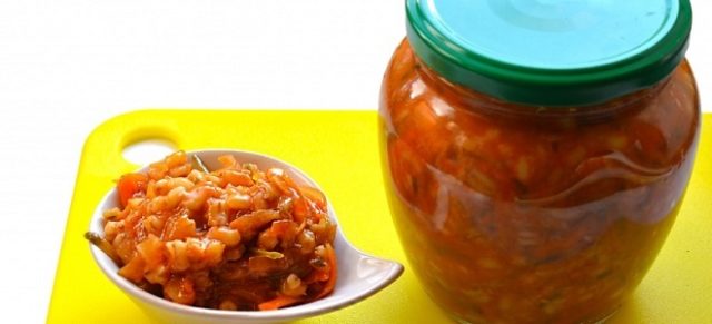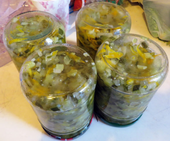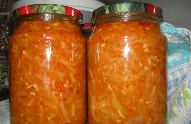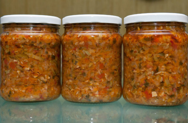 Se aconseja poner la mezcla en frascos inmediatamente después de sacarla de la estufa. Se aconseja cerrar la conservación en latas de 0,5 litros, ya que este volumen es suficiente para hacer encurtidos para el invierno.