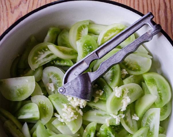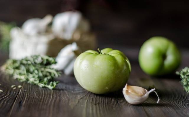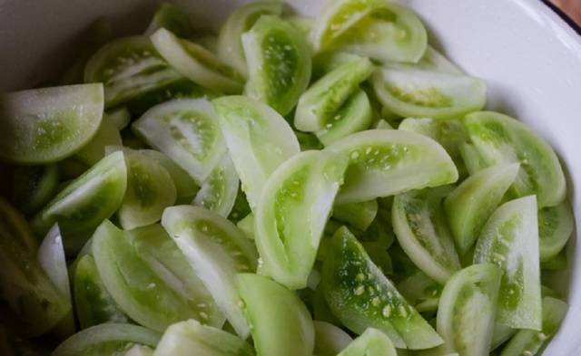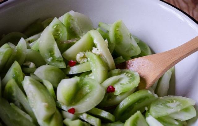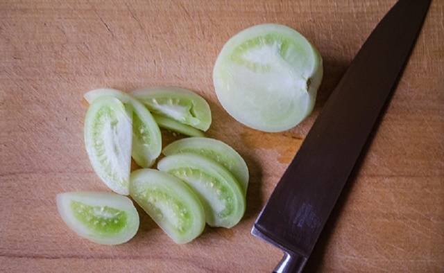 - Prepare los tomates verdes, no marrones. Necesitamos frutos en la etapa de madurez lechosa. Los dorados darán más jugo y quedarán muy suaves en ensaladas. Para la ensalada, seleccione solo frutas enteras, en buen estado y saludables para que el aperitivo no se eche a perder. Preste atención al estado de las pieles antes de iniciar el proceso de cocción.