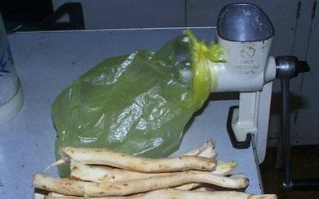 El rábano picante se pela y se tritura al final. Dado que su espíritu se desgasta bastante rápido, no debe ser cortado primero. Además, una picadora de carne no siempre hace un buen trabajo moliéndola. A veces es mejor usar un rallador fino común. Y en el recipiente donde muele la raíz de rábano picante, es mejor poner inmediatamente la bolsa para que el espíritu de rábano picante no corroa sus ojos.