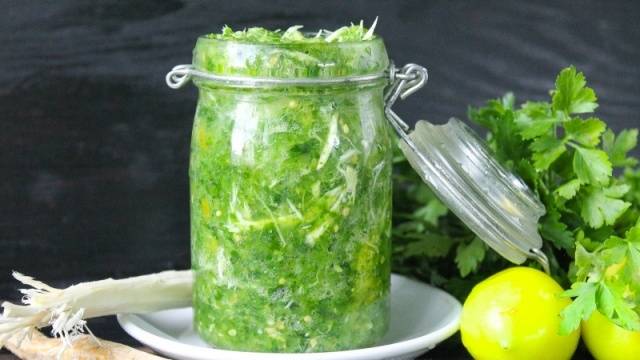 Mezcle todos los componentes triturados con sal y azúcar e inmediatamente póngalos en frascos y ciérrelos con tapas.Por supuesto, tal condimento con rábano picante para el invierno se almacenará durante mucho tiempo solo en un lugar fresco sin luz.