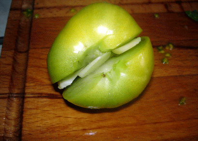 Las raíces de rábano picante deben pelarse y cortarse en trozos pequeños o rallarse. Después de pelar y dividir el ajo en rodajas, córtelo en rodajas finas.Los tomates se rellenan con rábano picante y ajo de la siguiente manera: se hacen varios cortes en la superficie de los tomates y se insertan trozos de las verduras antes mencionadas.