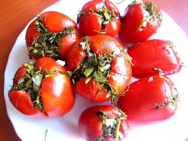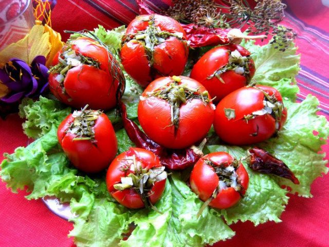 Además, el plato preparado según esta receta resulta muy bonito y se asemeja a unos tomates salados rápidos rellenos de ajo.