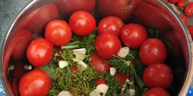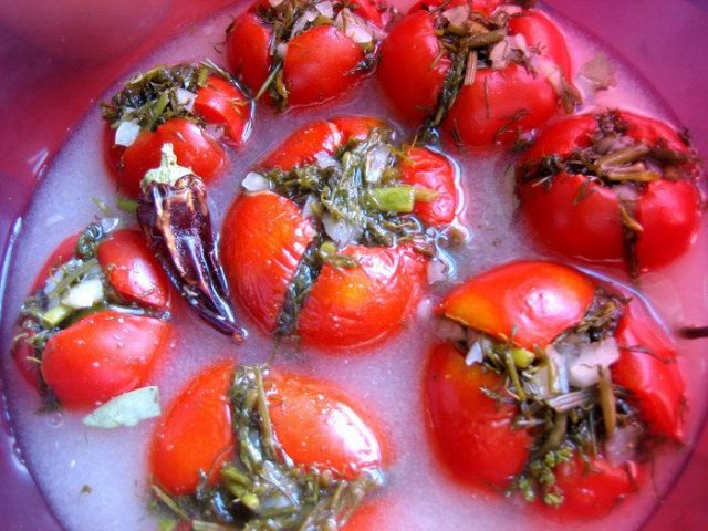- La salmuera se prepara por separado: la sal y el azúcar se disuelven en agua caliente, se enfrían y los tomates se vierten con esta mezcla.