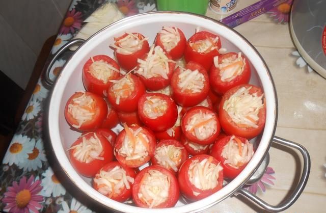 - Para los tomates, corte la quinta parte superior, pero no completamente, sino en forma de tapa.