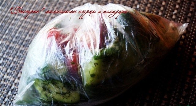 Hay otra receta según la cual los pepinos y tomates ligeramente salados se pueden cocinar muy rápidamente, en solo unas pocas horas. Esta receta utiliza el método de salazón en seco y no es necesario ni siquiera preparar el pepinillo. Además, para salar verduras ni siquiera necesita ningún utensilio, solo necesita una bolsa de plástico ordinaria, preferiblemente una doble, para mayor confiabilidad.