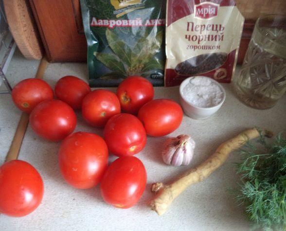 Con la misma tecnología de cocción estándar para verter verduras con salmuera fría o caliente, puede hacer tomates en escabeche con la participación directa de rábano picante. El picante y picante del aperitivo elaborado según esta receta no dejará indiferente a nadie.