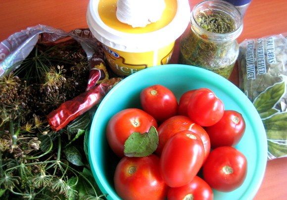 Al hacer tomates ligeramente salados, puede usar casi todas las especias y condimentos que tenga a mano. En verano, rico en follaje verde, hojas de grosella, cerezas, inflorescencias de eneldo y una variedad de verduras aromáticas del jardín serán útiles. En otoño, puedes usar hojas y raíces de rábano picante, y en invierno, semillas de mostaza, semillas de cilantro y todo tipo de mezclas de especias secas al gusto no serán superfluas.