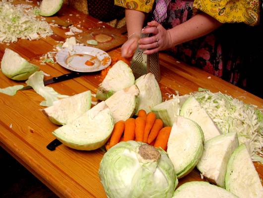 Pelar el repollo de las hojas tegumentarias, picarlo. Rallar las zanahorias peladas y lavadas. Libere el pimiento de las semillas, enjuague, corte en tiras pequeñas, cebollas, en mitades.