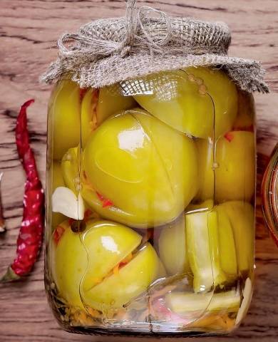 Solo queda tapar los frascos con espacios en blanco y envolverlos con una manta. Al día siguiente, la preparación de tomates verdes se lleva al sótano y puede comerlos solo después de un mes.
