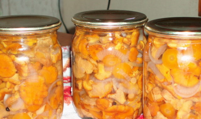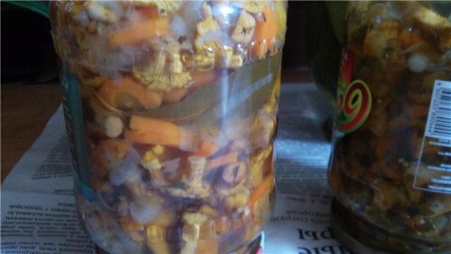 Las recetas para marinar rebozuelos para el invierno en frascos son diversas. Es especialmente original con la adición de verduras.