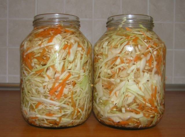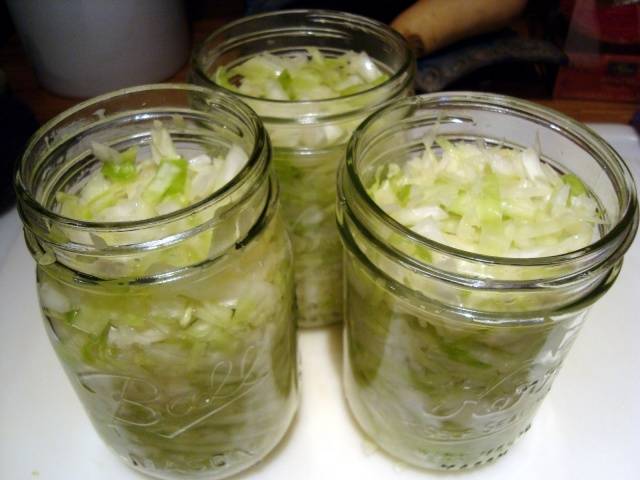 - El repollo se vierte en salmuera en frascos, que se sellan con tapas.