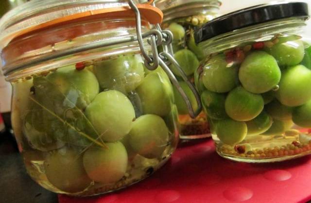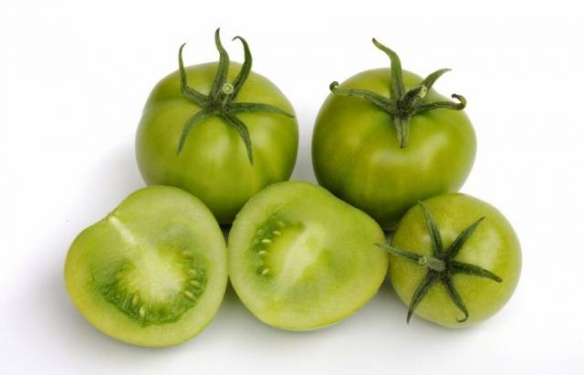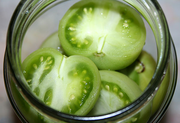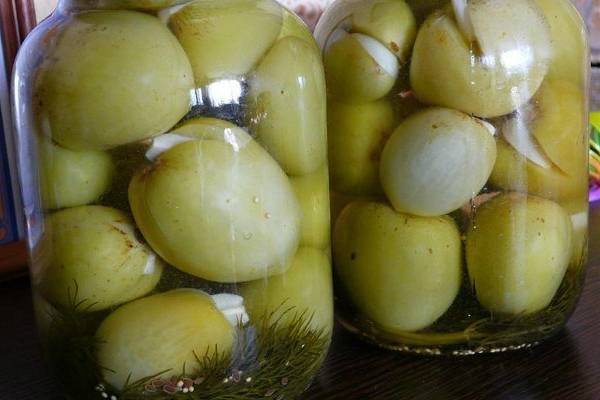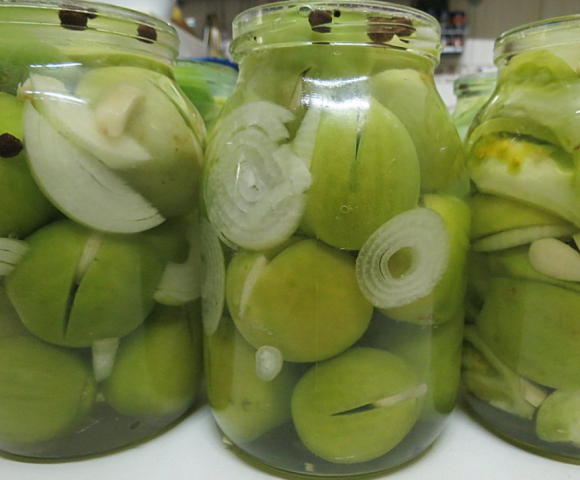 Tomates verdes en escabeche de forma rápida con ajo. Las verduras en escabeche se consumen como meriendas o ensalada. Se procesan tomates de color verde claro. La presencia de manchas verdes profundas indica el contenido de componentes tóxicos en ellas.
