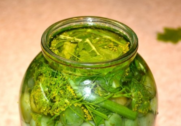 - En frascos de vidrio se colocan ajo, varias inflorescencias de eneldo, hojas de laurel y cereza, perejil finamente picado.