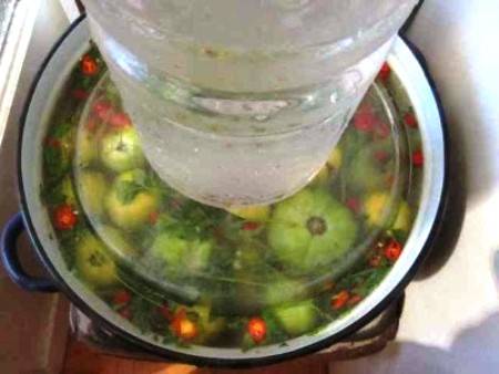 - Verter tomates con salmuera se puede hacer de diferentes maneras. Si desea probar un bocadillo en unos días, puede verter agua hirviendo sobre él. En el caso de que fermente tomates verdes en una cacerola durante el invierno, primero debe enfriar la salmuera a temperatura ambiente. Pero en cualquier caso, la opresión es indispensable.