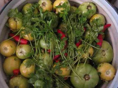 Los tomates verdes son una excelente materia prima para los giros invernales. Se pueden salar, encurtir y fermentar. Las más útiles son las verduras en escabeche, ya que el proceso se produce de forma natural, no se utiliza vinagre.