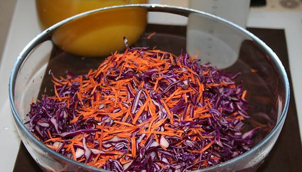 El repollo lavado debe cortarse finamente. El sabor de esta pieza depende en gran medida del método de corte. Por lo tanto, es mejor usar un rallador especial. Luego se preparan las zanahorias. Se lava, se limpia y se frota con un rallador grueso.