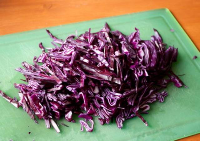 El primer paso es preparar el repollo. Debe lavarse y quitarse todas las hojas dañadas. Luego, la verdura se corta en rodajas finas en un rallador especial. Si el repollo se corta en trozos grandes, es posible que la ensalada no se marine bien y el sabor no sea tan delicado como cuando se corta en rodajas finas.