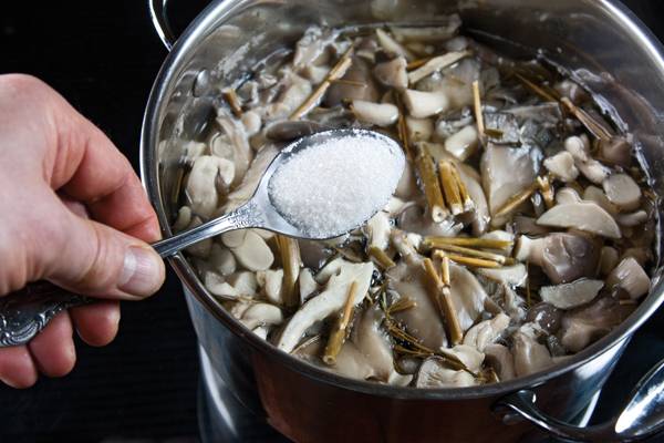 La cocción comienza con los propios hongos. El primer paso es cortar las tapas. Las piernas se pueden tirar, no nos servirán. A continuación, los sombreros se cortan en pedazos y se lavan con agua corriente. Los champiñones preparados se transfieren luego a una olla de agua adecuada. Allí también se agregan especias, azúcar, sal y se pone la masa en la estufa.