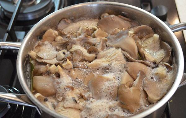 Ponemos la cacerola al fuego y encendemos el fuego. Lleve la marinada a ebullición y agregue los granos de pimienta y los clavos de olor. También en esta etapa, es necesario transferir los champiñones ostra picados y lavados a la sartén.