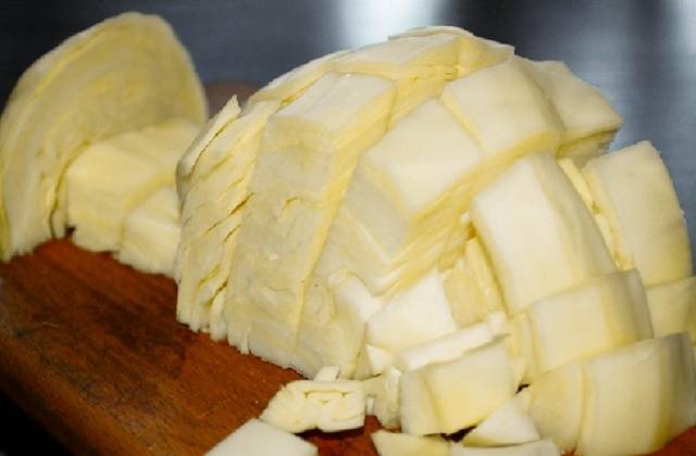 Limpiamos la col blanca de las hojas superiores si están sucias o estropeadas. Inmediatamente corte la cabeza de repollo por la mitad, luego cada mitad en 4 trozos más. Ahora solo tienes que cortarlo en pedazos, el repollo está listo.