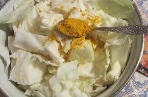 En el repollo, picado en damas, de acuerdo con las recomendaciones de la receta, vierta la cúrcuma, agregue aceite vegetal, mezcle suavemente.