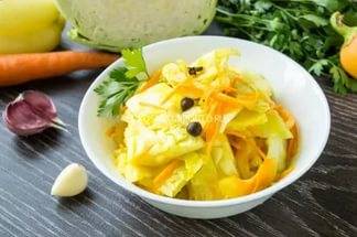 El repollo se encurtirá rápidamente, en un día puede cocinar cualquier plato con él. El repollo en escabeche con cúrcuma, colocado en recipientes convenientes, se puede almacenar en un lugar fresco.