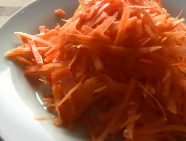 - Frotamos las zanahorias en un rallador regular o coreano, lo principal es que resultan ser pajitas largas.