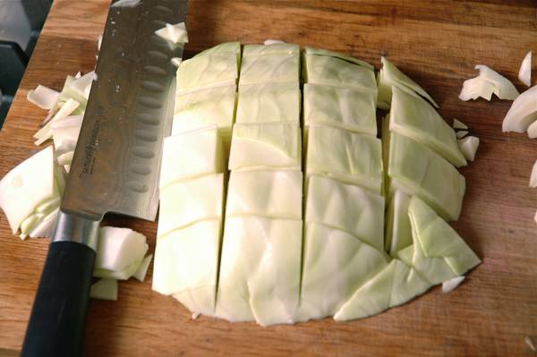 - Esta receta implica cortar el repollo en grandes en pedazos.