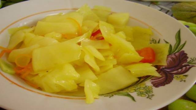 Cubre la col con un plato y pon una jarra de agua. Marinaremos las verduras durante no más de 12 horas. Para el almuerzo, puede servir una ensalada de repollo en escabeche de color amarillo ámbar con cúrcuma para platos de carne o pescado y papas hervidas.