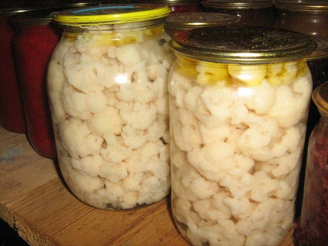 Preesterilice el frasco y ponga unos dientes de ajo, 3-4 granos de pimienta negra y 2 hojas de laurel. Luego llene el frasco con inflorescencias de coliflor. Agregue una zanahoria y una cebolla finamente picadas si lo desea.