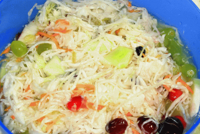 De acuerdo con esta receta, las verduras se amasan ligeramente en un recipiente aparte, se vierten con adobo caliente y se presionan con una tapa o plato con una ligera opresión para que el jugo se destaque mejor.