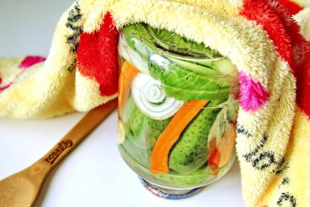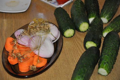 - Ponga pepinos, zanahorias, cebollas y eneldo en frascos esterilizados. También agregue sal y azúcar.