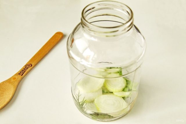 - Ponga aros de cebolla, hojas de rábano picante y eneldo en el fondo del frasco.