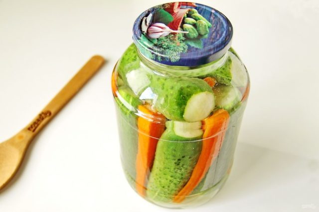 - Agregue vinagre a la mezcla de verduras y vierta los frascos con agua fría purificada.¡Importante! El agua debe estar purificada, embotellada o filtrada. De lo contrario, existe la posibilidad de fermentación excesiva y deterioro del producto.
