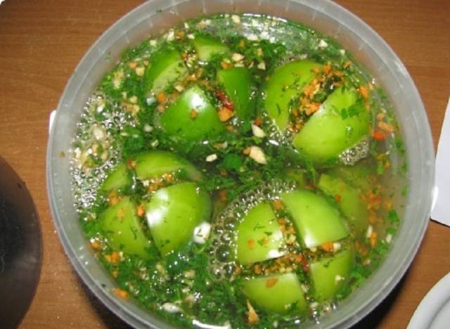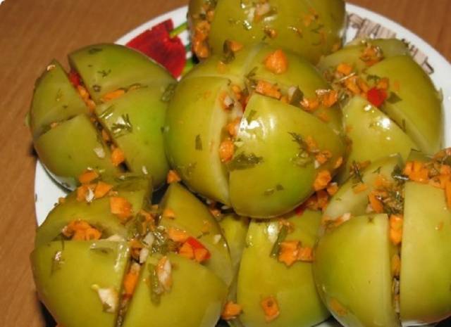 Hay muchos bocadillos de tomates verdes. Las frutas frescas no son aptas para el consumo, pero en ensaladas o relleno increíblemente delicioso. Los tomates verdes en escabeche se preparan con diferentes rellenos.