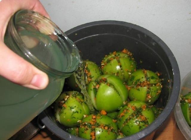 Ahora los tomates verdes rellenos necesitan calor. Si la temperatura ambiente no es inferior a 20 ° C, entonces está bien. Si es más bajo, puede acercar la pieza de trabajo a los dispositivos de calentamiento. Después de 4 días, nuestros tomates verdes en escabeche rellenos de especias y hierbas están listos. ¡Puedes probar!