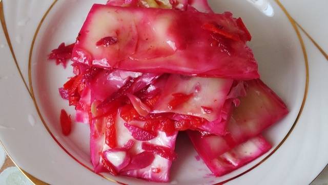 Hay una diáspora coreana bastante grande en Ucrania, muchos de sus representantes se dedican al cultivo de verduras y a la preparación de ensaladas para la venta. La remolacha se llama allí "remolacha" y es uno de los productos más populares. Sugerimos marinar el repollo coreano durante el invierno.